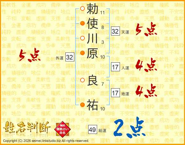 勅(11画)使(8画)川(3画)原(10画) 良(7画)祐(10画)