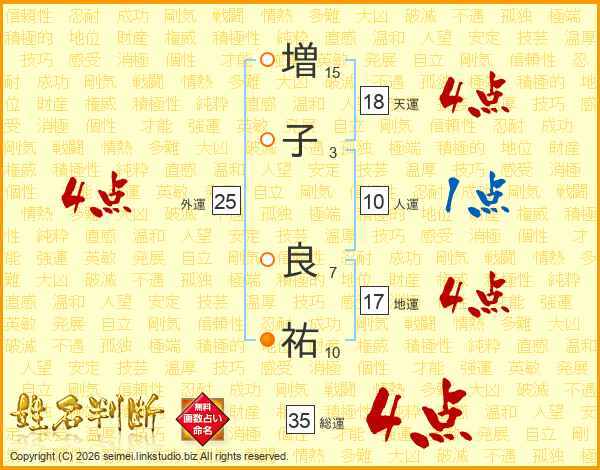 増(15画)子(3画) 良(7画)祐(10画)