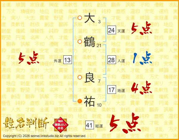 大鶴良祐さんの総運は41画の5点!