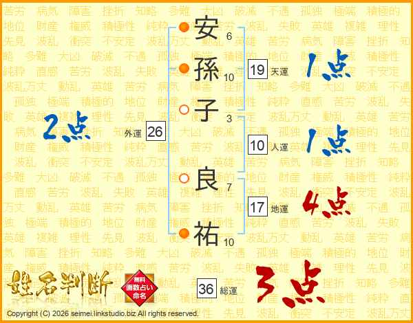 安(6画)孫(10画)子(3画) 良(7画)祐(10画)