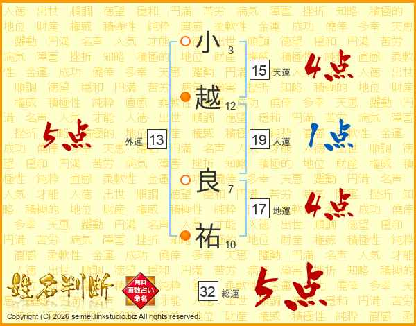 生活面を象徴する運勢です。外部から受ける影響力を表し、結婚運、家庭運や職場、環境への順応性を表します。総運から人運を引いた画数。姓や名が1文字の場合を除く。