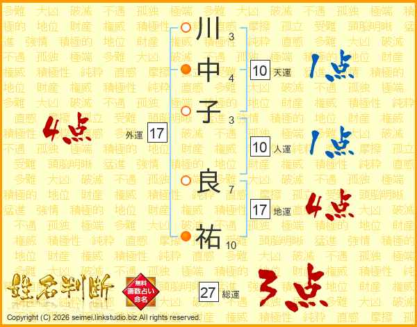 川(3画)中(4画)子(3画) 良(7画)祐(10画)