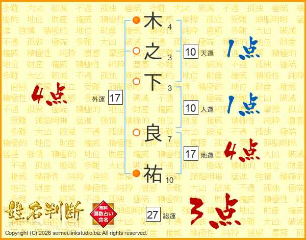 木(4画)之(3画)下(3画) 良(7画)祐(10画)