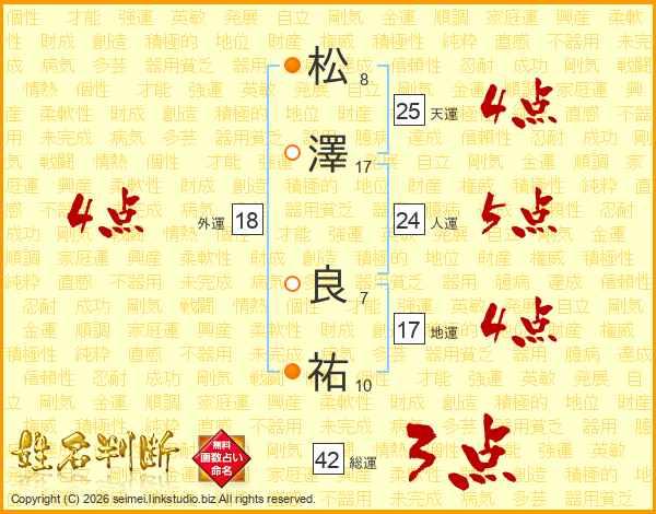松(8画)澤(17画) 良(7画)祐(10画)