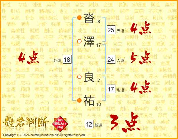 沓(8画)澤(17画) 良(7画)祐(10画)