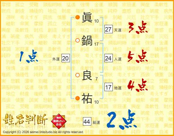 眞(10画)鍋(17画) 良(7画)祐(10画)