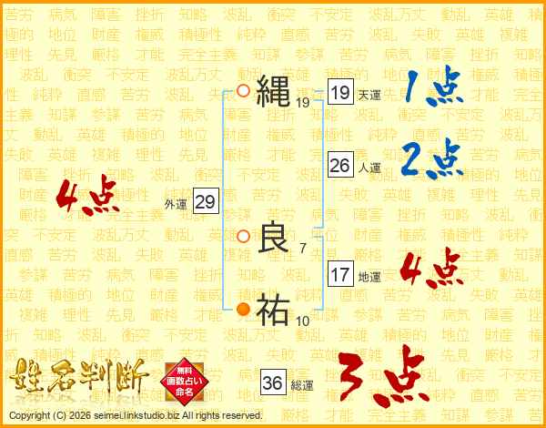 生活面を象徴する運勢です。外部から受ける影響力を表し、結婚運、家庭運や職場、環境への順応性を表します。総運から人運を引いた画数。姓や名が1文字の場合を除く。