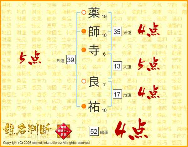 薬(19画)師(10画)寺(6画) 良(7画)祐(10画)