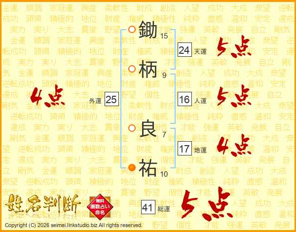 鋤(15画)柄(9画) 良(7画)祐(10画)