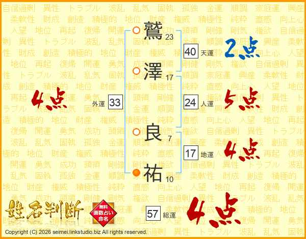 鷲(23画)澤(17画) 良(7画)祐(10画)