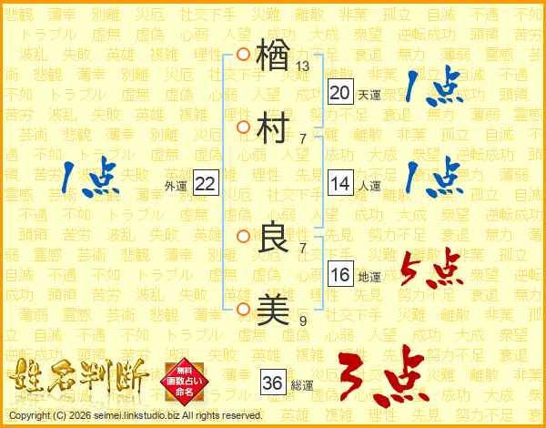 生活面を象徴する運勢です。外部から受ける影響力を表し、結婚運、家庭運や職場、環境への順応性を表します。総運から人運を引いた画数。姓や名が1文字の場合を除く。
