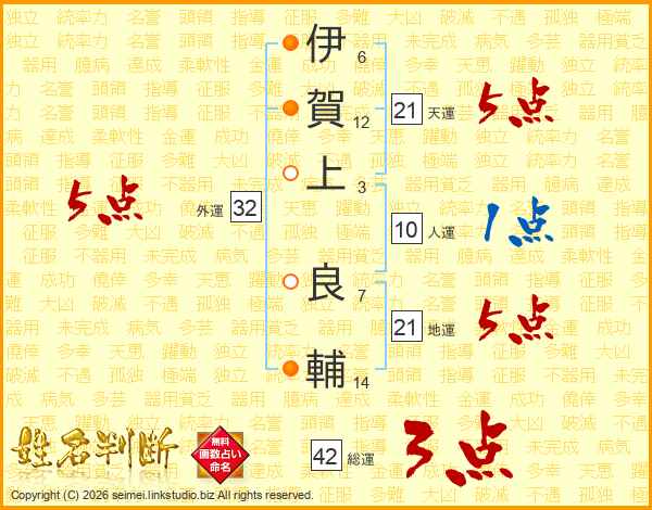 伊(6画)賀(12画)上(3画) 良(7画)輔(14画)