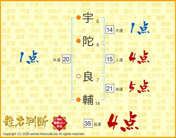 宇(6画)陀(8画) 良(7画)輔(14画)