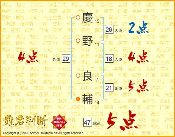 慶(15画)野(11画) 良(7画)輔(14画)