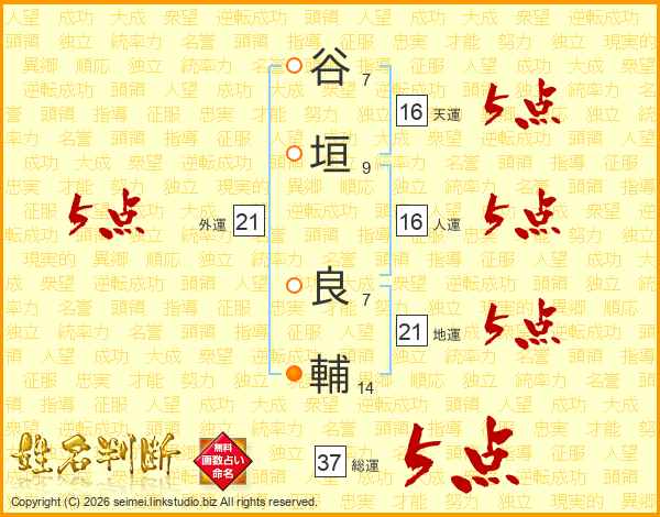 谷(7画)垣(9画) 良(7画)輔(14画)