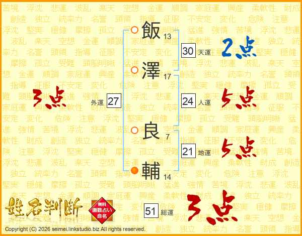 飯(13画)澤(17画) 良(7画)輔(14画)