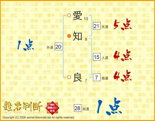 生活面を象徴する運勢です。外部から受ける影響力を表し、結婚運、家庭運や職場、環境への順応性を表します。総運から人運を引いた画数。姓や名が1文字の場合を除く。