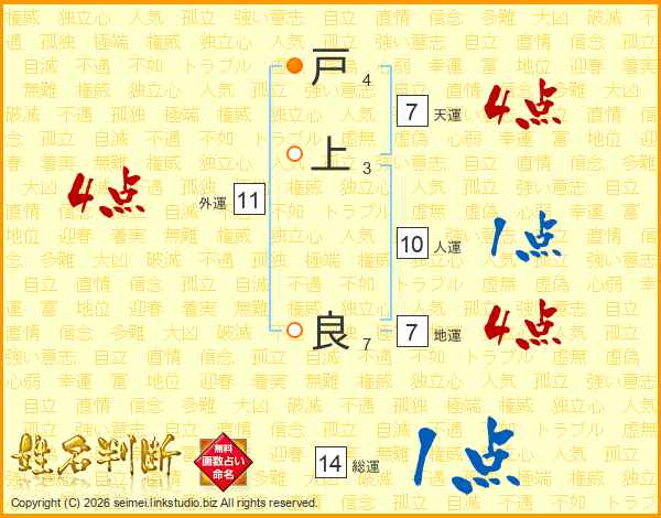 生活面を象徴する運勢です。外部から受ける影響力を表し、結婚運、家庭運や職場、環境への順応性を表します。総運から人運を引いた画数。姓や名が1文字の場合を除く。