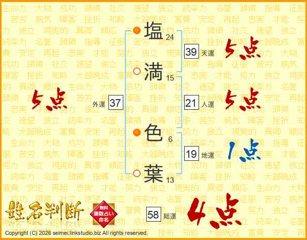 生活面を象徴する運勢です。外部から受ける影響力を表し、結婚運、家庭運や職場、環境への順応性を表します。総運から人運を引いた画数。姓や名が1文字の場合を除く。