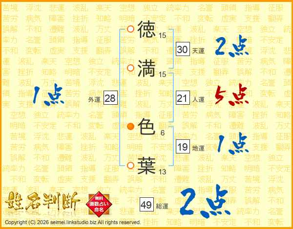 生活面を象徴する運勢です。外部から受ける影響力を表し、結婚運、家庭運や職場、環境への順応性を表します。総運から人運を引いた画数。姓や名が1文字の場合を除く。