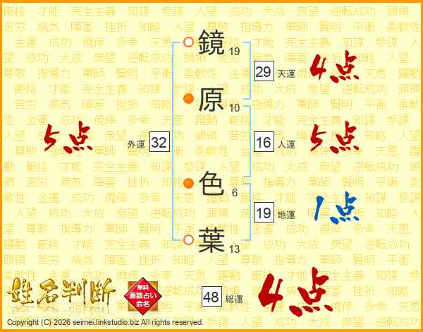 鏡(19画)原(10画) 色(6画)葉(13画)