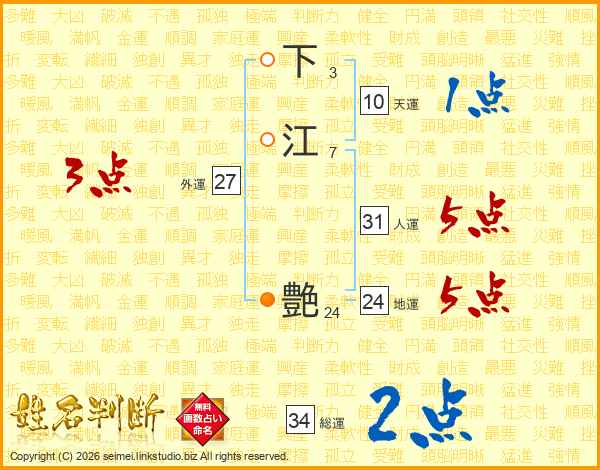 生活面を象徴する運勢です。外部から受ける影響力を表し、結婚運、家庭運や職場、環境への順応性を表します。総運から人運を引いた画数。姓や名が1文字の場合を除く。