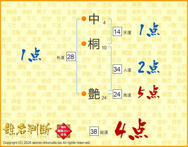 生活面を象徴する運勢です。外部から受ける影響力を表し、結婚運、家庭運や職場、環境への順応性を表します。総運から人運を引いた画数。姓や名が1文字の場合を除く。
