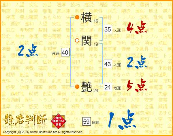 生活面を象徴する運勢です。外部から受ける影響力を表し、結婚運、家庭運や職場、環境への順応性を表します。総運から人運を引いた画数。姓や名が1文字の場合を除く。