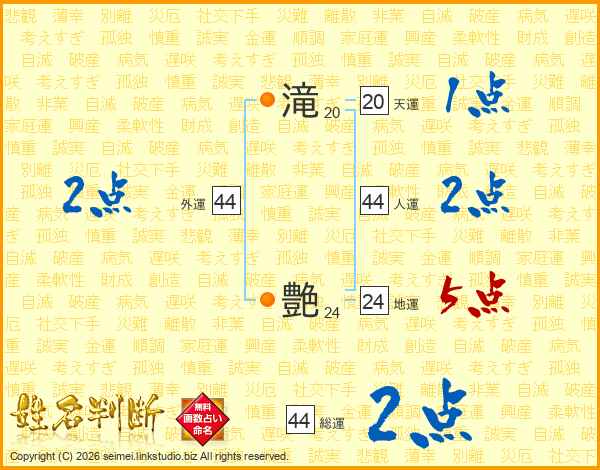 生活面を象徴する運勢です。外部から受ける影響力を表し、結婚運、家庭運や職場、環境への順応性を表します。総運から人運を引いた画数。姓や名が1文字の場合を除く。
