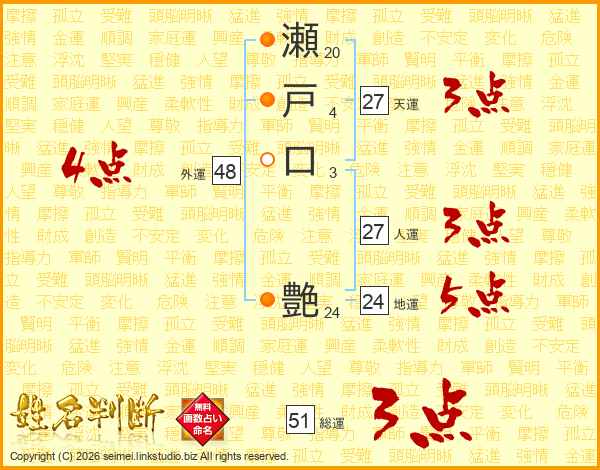 瀬(20画)戸(4画)口(3画) 艶(24画)