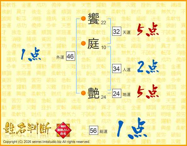 生活面を象徴する運勢です。外部から受ける影響力を表し、結婚運、家庭運や職場、環境への順応性を表します。総運から人運を引いた画数。姓や名が1文字の場合を除く。