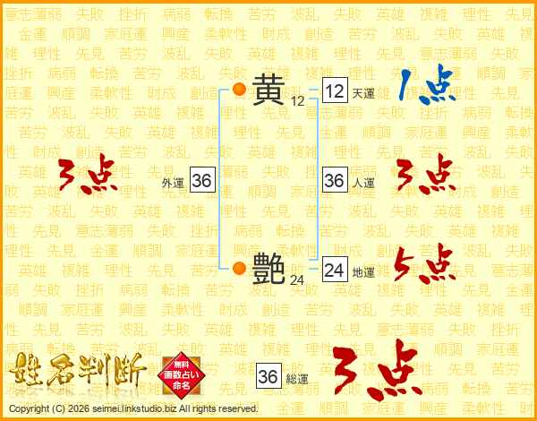 生活面を象徴する運勢です。外部から受ける影響力を表し、結婚運、家庭運や職場、環境への順応性を表します。総運から人運を引いた画数。姓や名が1文字の場合を除く。