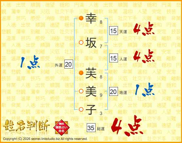 幸(8画)坂(7画) 芙(8画)美(9画)子(3画)