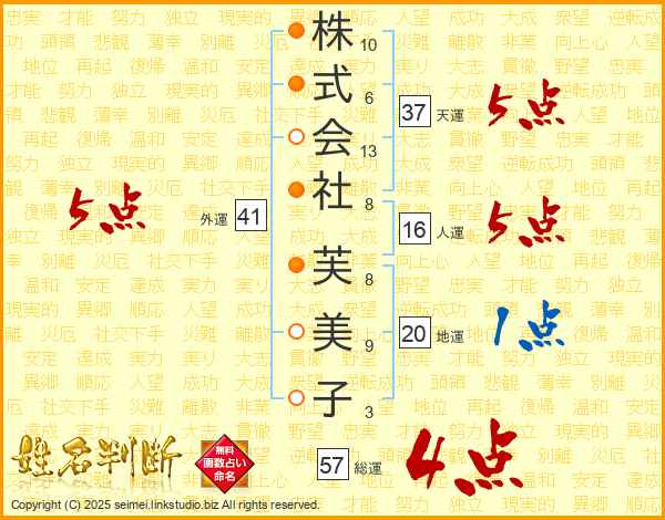 株(10画)式(6画)会(13画)社(8画) 芙(8画)美(9画)子(3画)