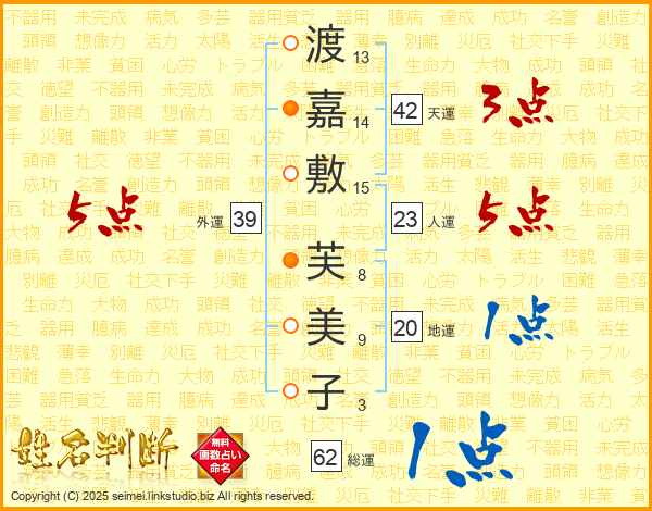 渡(13画)嘉(14画)敷(15画) 芙(8画)美(9画)子(3画)