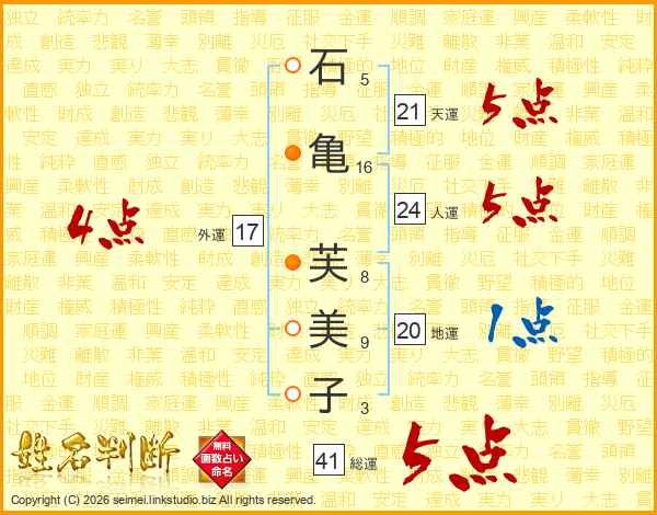 石(5画)亀(16画) 芙(8画)美(9画)子(3画)