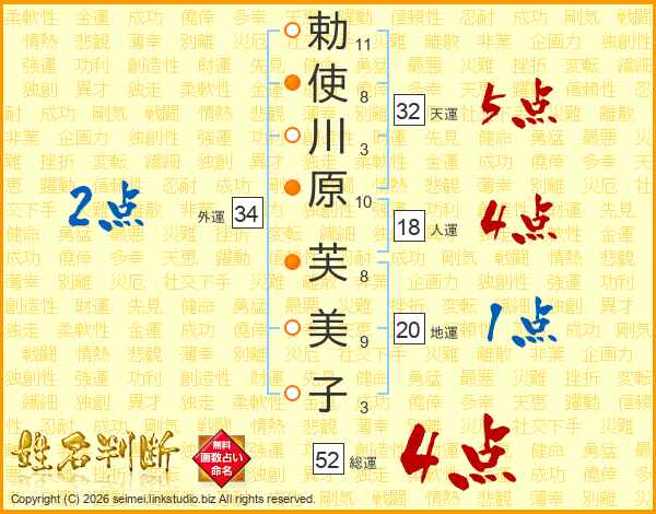 勅(11画)使(8画)川(3画)原(10画) 芙(8画)美(9画)子(3画)