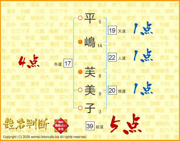 平嶋芙美子さんの総運は39画の5点!