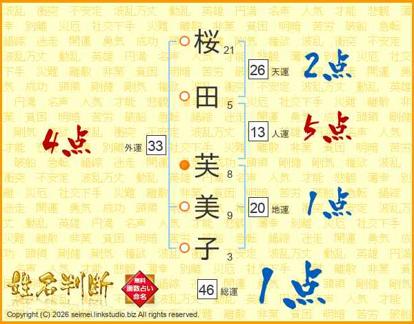 桜(21画)田(5画) 芙(8画)美(9画)子(3画)