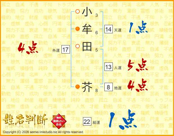 生活面を象徴する運勢です。外部から受ける影響力を表し、結婚運、家庭運や職場、環境への順応性を表します。総運から人運を引いた画数。姓や名が1文字の場合を除く。