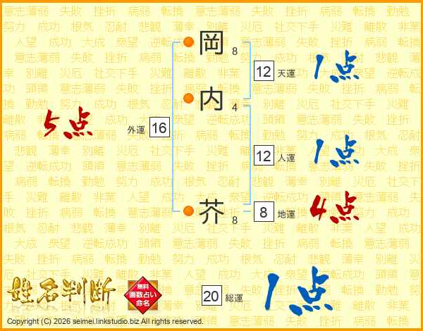 生活面を象徴する運勢です。外部から受ける影響力を表し、結婚運、家庭運や職場、環境への順応性を表します。総運から人運を引いた画数。姓や名が1文字の場合を除く。