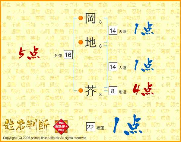 生活面を象徴する運勢です。外部から受ける影響力を表し、結婚運、家庭運や職場、環境への順応性を表します。総運から人運を引いた画数。姓や名が1文字の場合を除く。