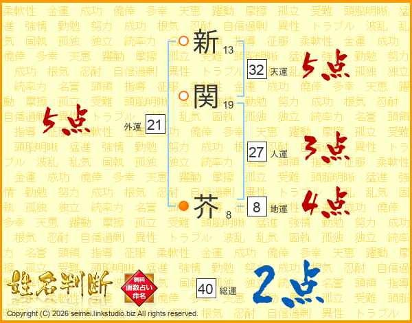 生活面を象徴する運勢です。外部から受ける影響力を表し、結婚運、家庭運や職場、環境への順応性を表します。総運から人運を引いた画数。姓や名が1文字の場合を除く。