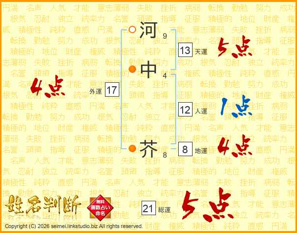 生活面を象徴する運勢です。外部から受ける影響力を表し、結婚運、家庭運や職場、環境への順応性を表します。総運から人運を引いた画数。姓や名が1文字の場合を除く。