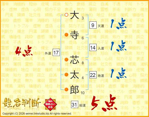 大寺芯太郎さんの総運は31画の5点!
