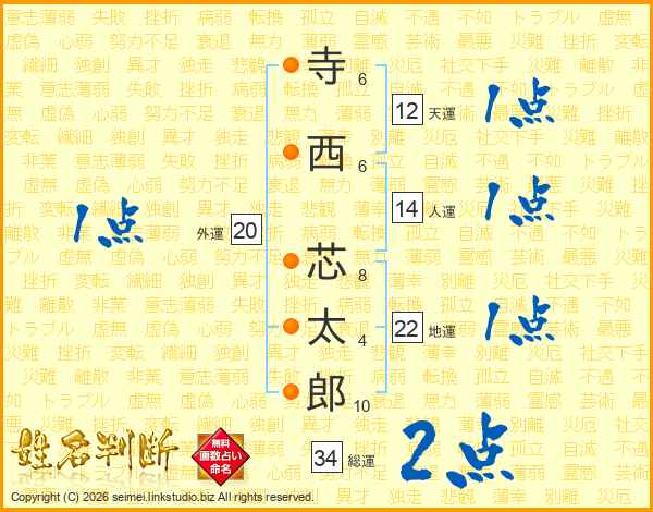 寺(6画)西(6画) 芯(8画)太(4画)郎(10画)