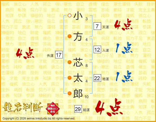 小(3画)方(4画) 芯(8画)太(4画)郎(10画)