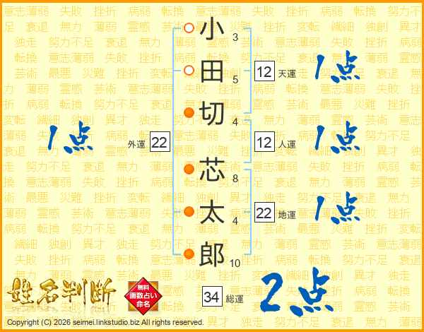 小(3画)田(5画)切(4画) 芯(8画)太(4画)郎(10画)