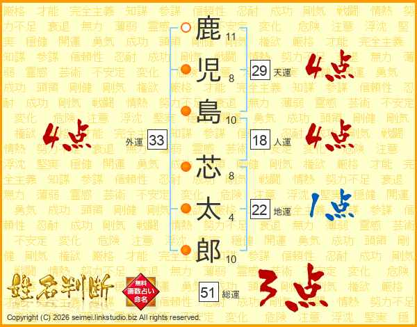 鹿(11画)児(8画)島(10画) 芯(8画)太(4画)郎(10画)