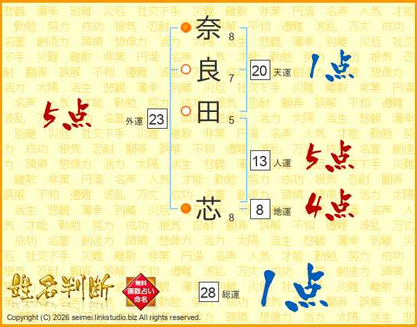 生活面を象徴する運勢です。外部から受ける影響力を表し、結婚運、家庭運や職場、環境への順応性を表します。総運から人運を引いた画数。姓や名が1文字の場合を除く。